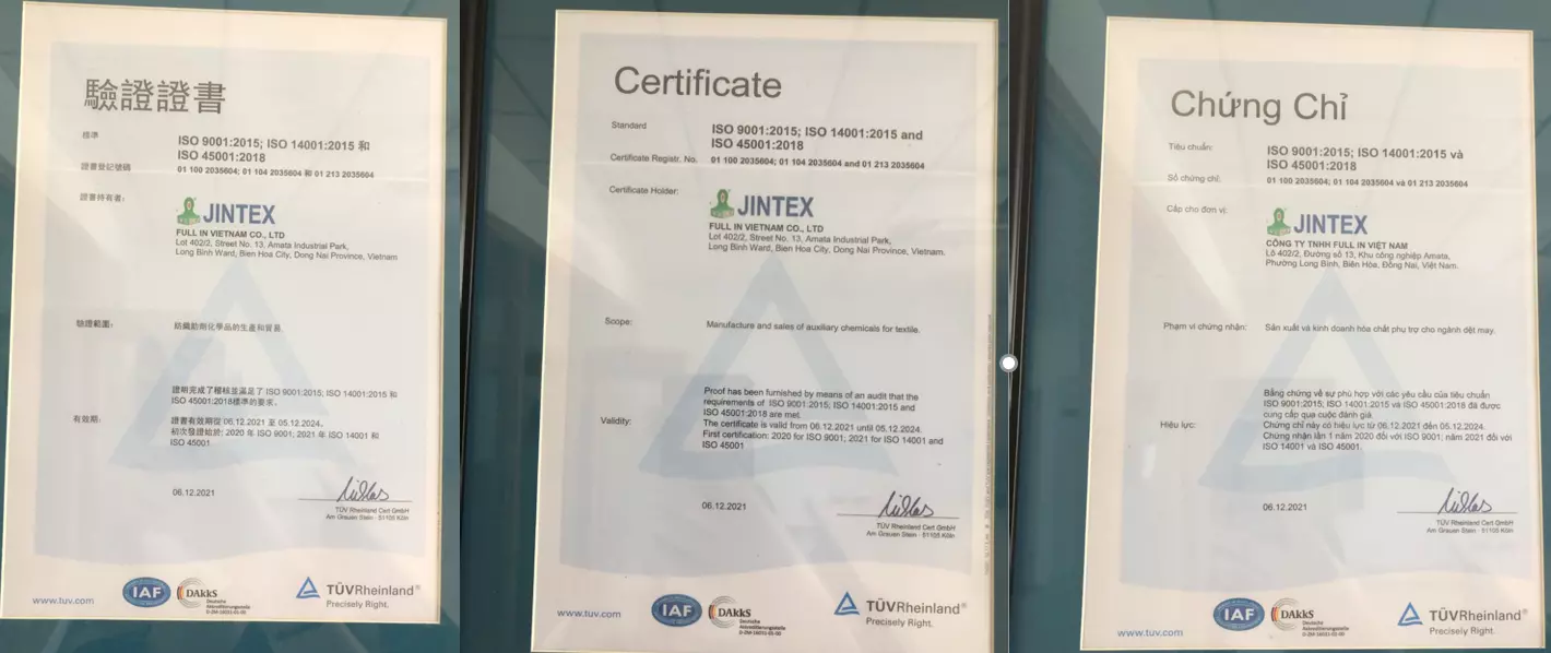 Nhà máy JINTEX Việt Nam đã hoàn thành chứng chỉ ISO9001/ ISO14001/ ISO45001, sẽ tiếp tục cung cấp các loại hóa chất chất lượng cao, đáp ứng tiêu chuẩn cho khách hàng.